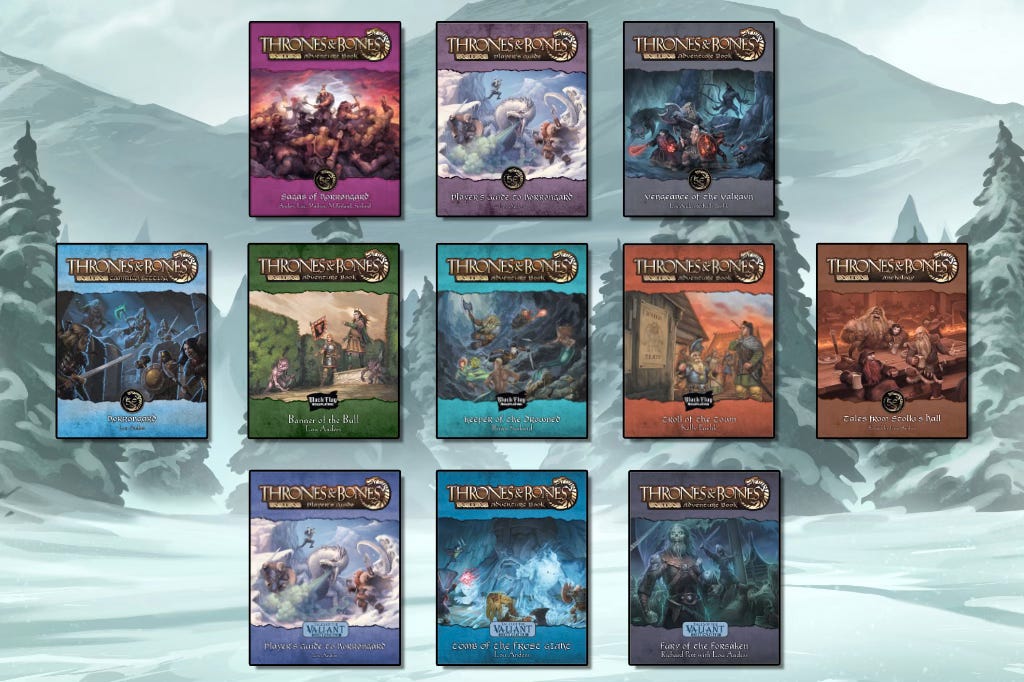 Part of the Kickstarter will be a hardcover compilation/expansion of the first three Tales of the Valiant adventures, called The Bense Trilogy. Between the two hardcovers, you can play a Tier One adventure path set in Norrøngard. Stretch goals may add two more hardcovers to the project.
